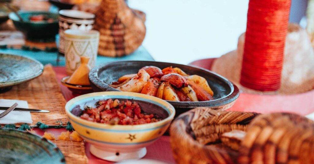 • Lamb or prune tagine, vegetable couscous, and Amazigh omelets simmered in clay.